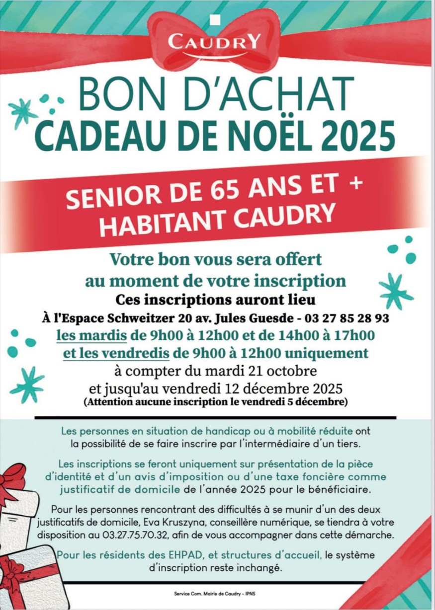 Bon d'achat Cadeau de Noël 2025 pour les séniors de 65 ans et plus Habitant Caudry