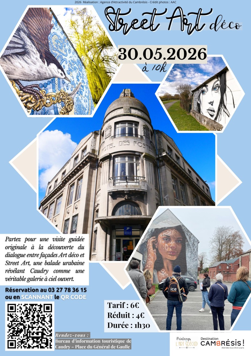 Le samedi 30 mai 2026 à 10h, la ville de Caudry invite habitants et visiteurs à une immersion originale au croisement du patrimoine et de la création contemporaine avec une visite guidée dédiée au dialogue entre façades Art déco et Street Art.