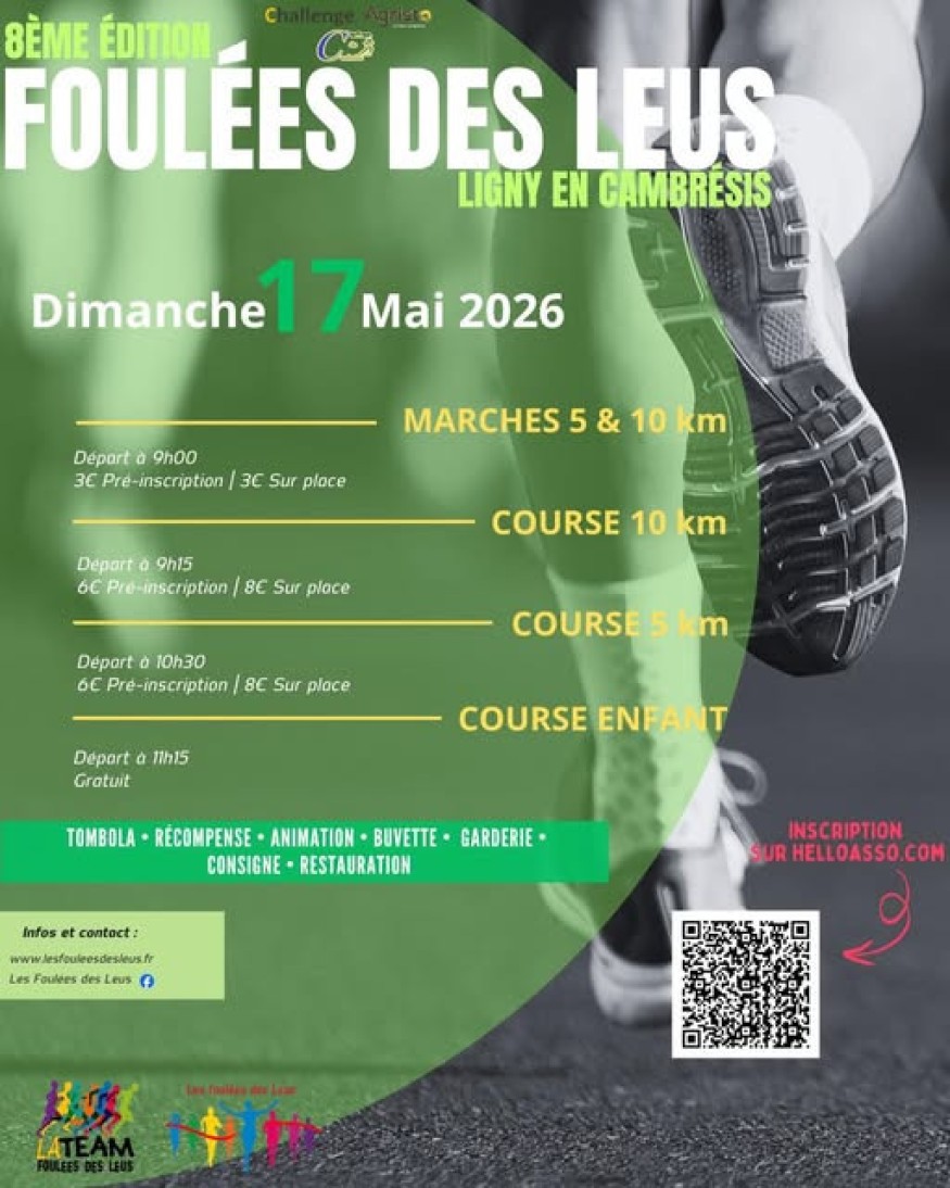 Informations pratiques : Date : Dimanche 17 mai 2026 Lieu : Ligny-en-Cambrésis Site web : www.lesfouleesdesleus.fr Réseaux sociaux : Page Facebook « Les Foulées des Leus »