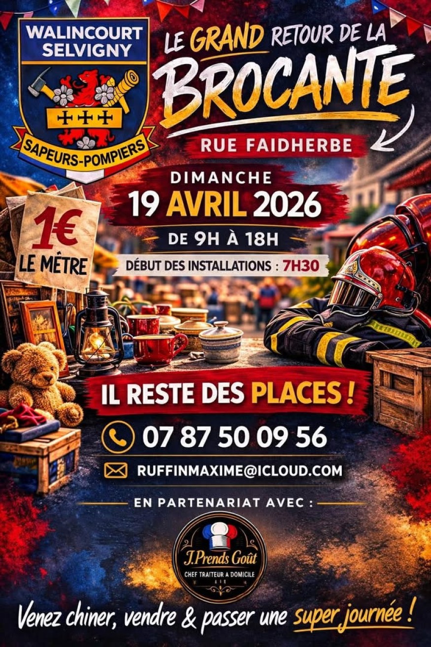Après une attente très appréciée des amateurs de chine et de convivialité, la brocante organisée par les sapeurs-pompiers de Walincourt-Selvigny fait son grand retour. L’événement se tiendra le dimanche 19 avril 2026, rue Faidherbe, de 9h à 18h.
