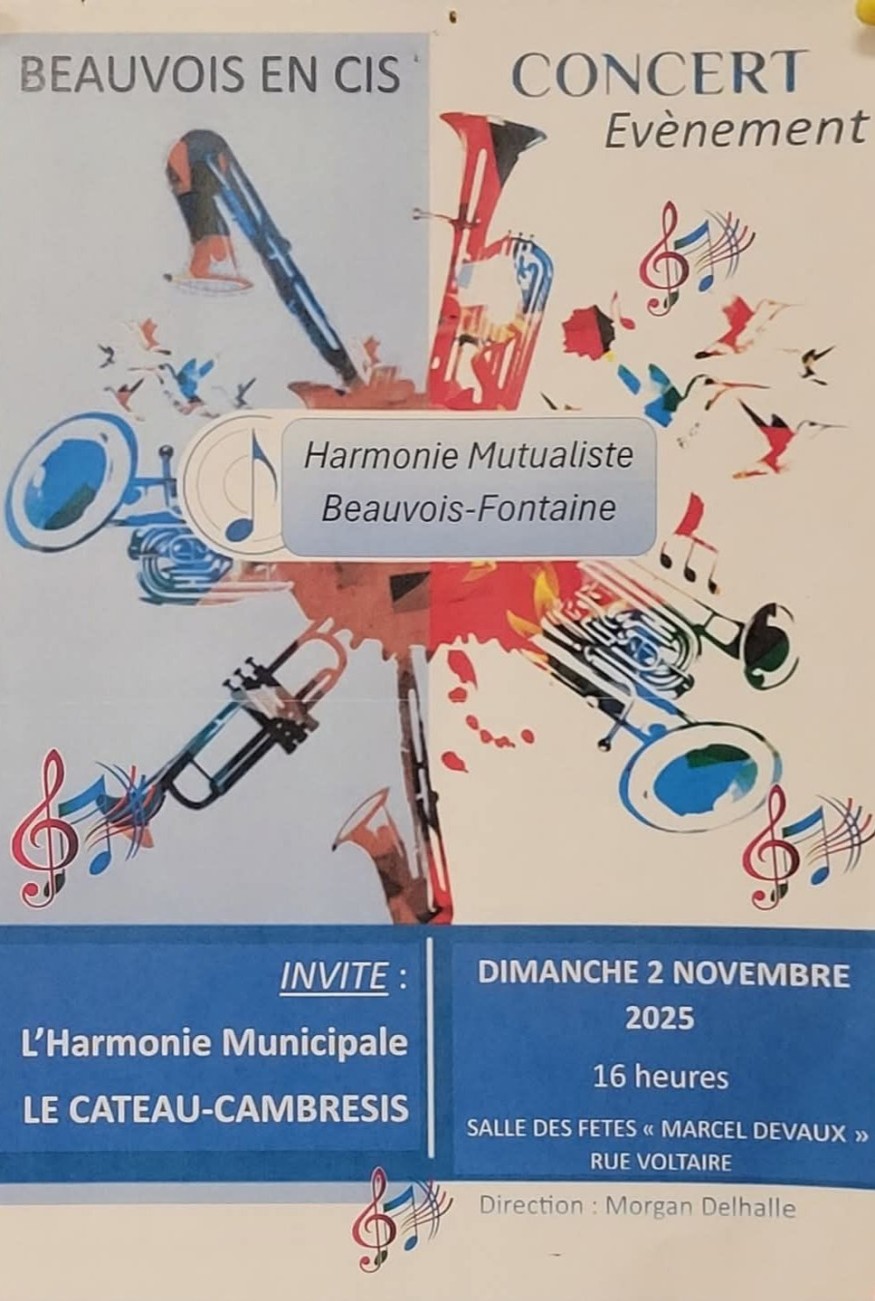 Concert événement le dimanche 2 novembre à 16h salle des fêtes "Marcel DEVAUX" à Beauvois-en-Cambrésisl'Harmonie Mutualiste Beauvois-Fontaine invite l'Harmonie du Cateau Cambrésis.