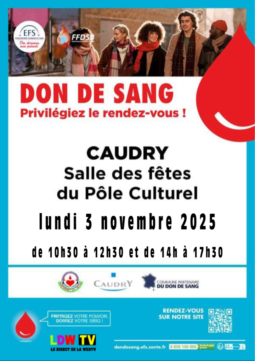 L'Établissement Français du Sang sera présent à la salle des fêtes du Pôle Culturel de Caudry pour collecter votre sang :