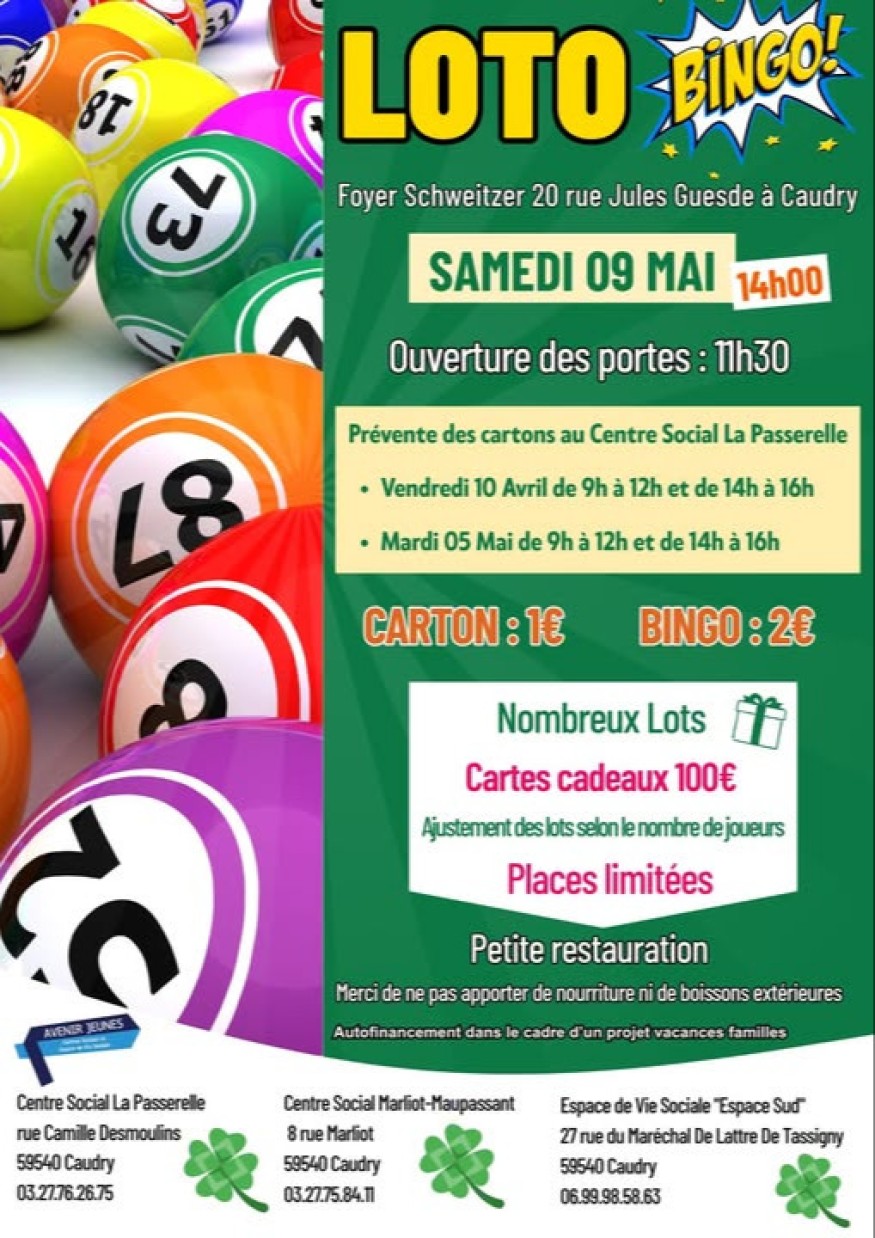 L’association Avenir Jeunes et les centres sociaux de Caudry se mobilisent pour un après-midi placé sous le signe de la convivialité et de la chance. Le samedi 9 mai, un grand Loto-Bingo sera organisé au Foyer Schweitzer (20 rue Jules Guesde).