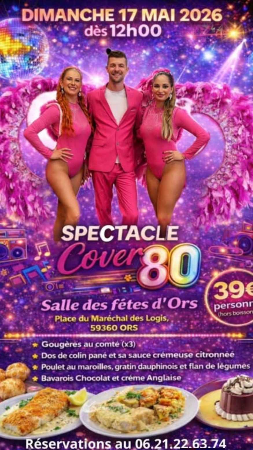 En bref : Quoi : Spectacle "Cover 80" avec repas. Quand : Dimanche 17 mai 2026, à partir de 12h00. Où : Salle des fêtes, 59360 ORS. Réservations : 06.21.22.63.74.