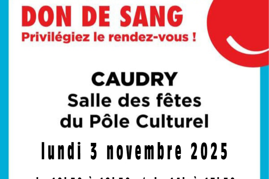 L'Établissement Français du Sang sera présent à la salle des fêtes du Pôle Culturel de Caudry pour collecter votre sang : - lundi 3 novembre de 10h30 à 12h30 et de 14h à 17h30 Sans engagement, libre, ponctuel, le don de sang change la vie d'un million de personnes en France chaque année. Une femme qui accouche, une personne victime d'un accident, un malade atteint de cancer ...