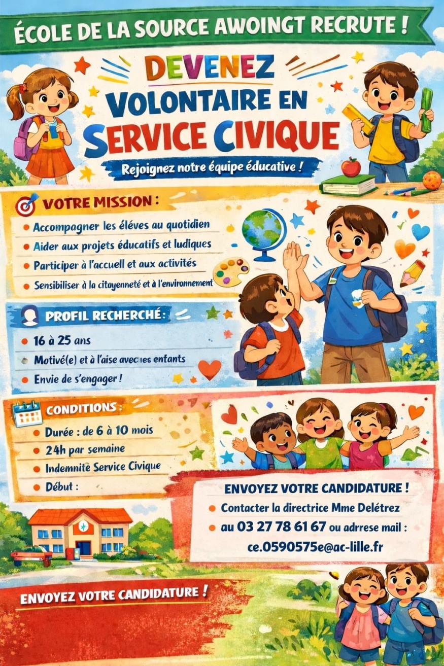 L’école primaire d’Awoingt lance un appel aux jeunes de 16 à 25 ans souhaitant s’investir dans une mission humaine et pédagogique au sein de son équipe éducative.