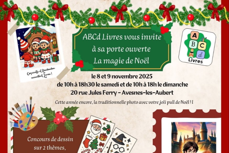 ABCd Livres vous invite à sa porte ouverte La Magie de Noël Le 8 et 9 novembre 2025 de 10h à 18h30 le samedi et de 10h à 18h le dimanche 20 rue Jules Ferry à Avesnes-Les-Aubert Cette année encore la traditionnelle photo avec votre joli pull de Noël !! Concours de dessin sur 2 thèmes, Noël ou Harry Potter Vente exceptionnelle Harry Potter Les enfants nous comptons sur vous pour venir...