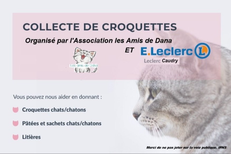 L'Association les amis de Dana organise Une Collecte de Croquettes Samedi 15 novembre 2025 de 9h à 17h Dans votre centre Leclerc Caudry Croquettes chats / Chatons Pâtées et sachets chats / chatons Litières.... ...