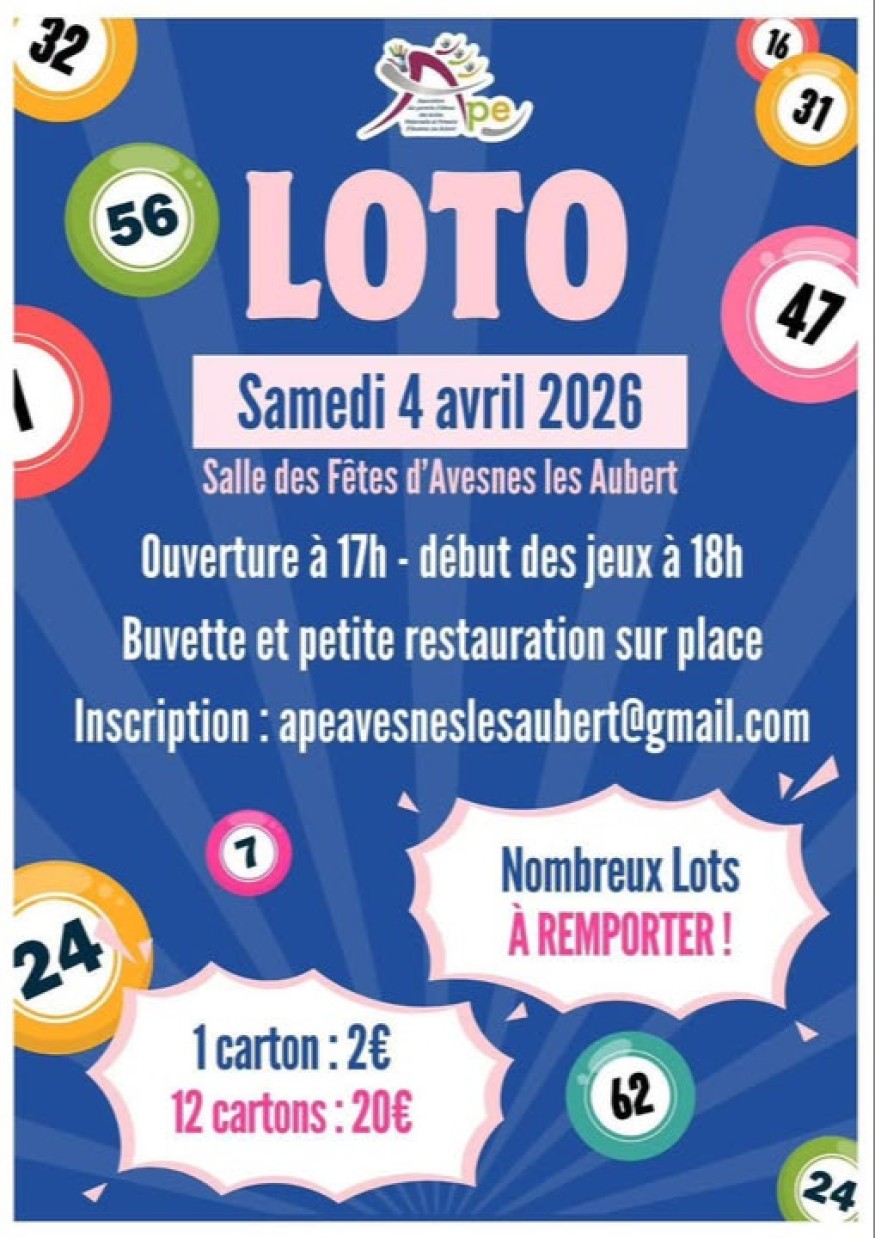 Envie de partager un moment chaleureux tout en tentant votre chance ? L’Association des Parents d’Élèves (APE) d’Avesnes-les-Aubert vous invite à son grand loto, un rendez-vous incontournable pour petits et grands.