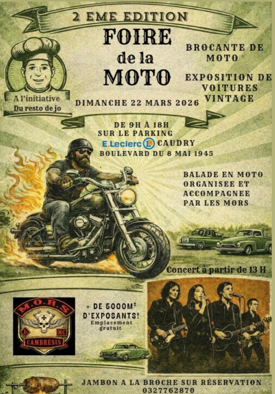 Le dimanche 22 mars 2026, les passionnés de deux-roues et d’univers vintage ont rendez-vous à Le Resto de Jo pour la deuxième édition de la Foire de la Moto. Cet événement, désormais attendu par les amateurs et curieux de la région, se déroulera de 9h à 18h sur le parking du E.Leclerc de Caudry, boulevard du 8 Mai 1945.