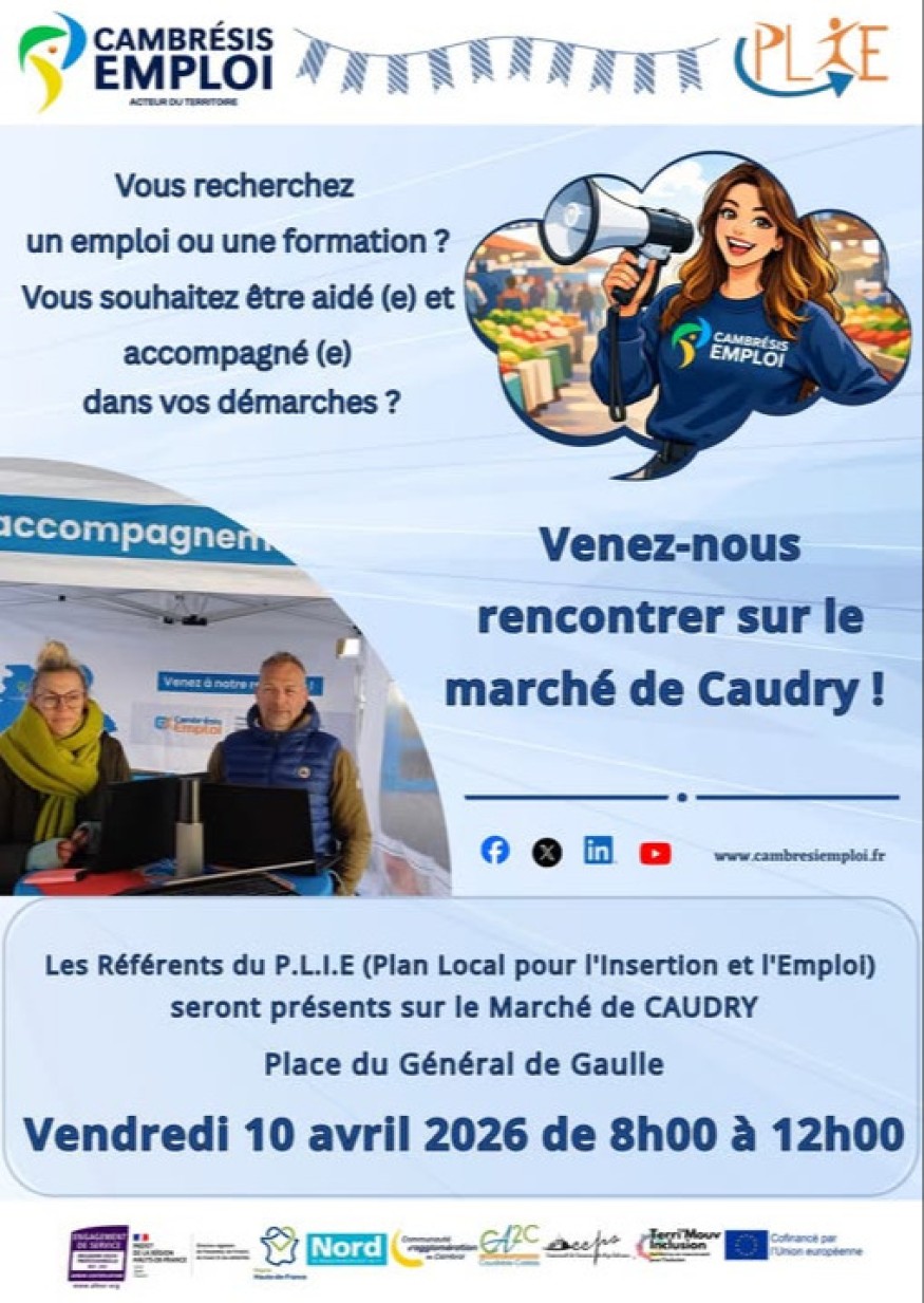Le vendredi 10 avril 2026, les référents du P.L.I.E (Plan Local pour l'Insertion et l'Emploi) de Cambrésis Emploi tiendront un stand d'information sur le marché de Caudry. Une occasion de bénéficier d'un accompagnement personnalisé en plein cœur de la ville.