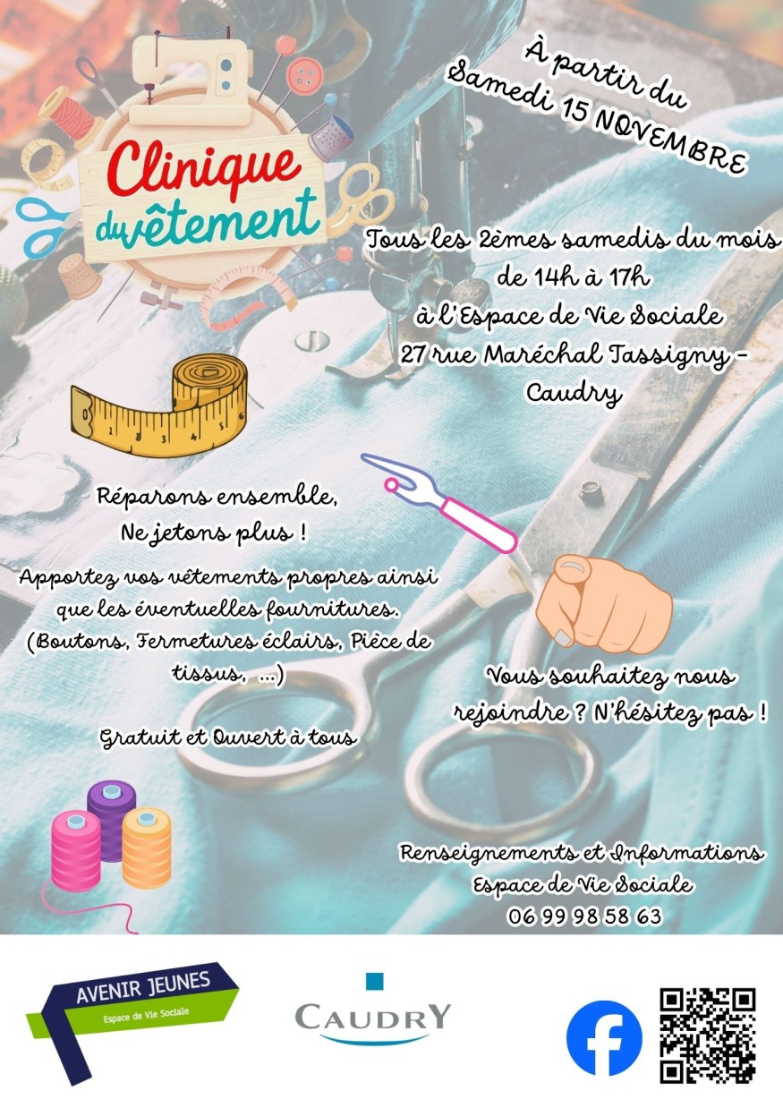 A partir du 15 novembre 2025, tous les 2èmes samedis du mois, de 14h00 à 17h00, l'Espace de Vie sociale vous donne rendez-vous pour la Clinique du vêtement.Pour éviter de jeter, Réparons ensemble !Il vous suffit d'apporter vos vêtements propres ainsi que les éventuelles fournitures (boutons, fermetures éclair, pièces de tissus...) !N'hésitez pas, c'est gratuit et ouvert à tous ! Renseignements à l'Espace de Vie Sociale27 rue du Maréchal de Lattre de Tassigny et au 06 99 98 58 63