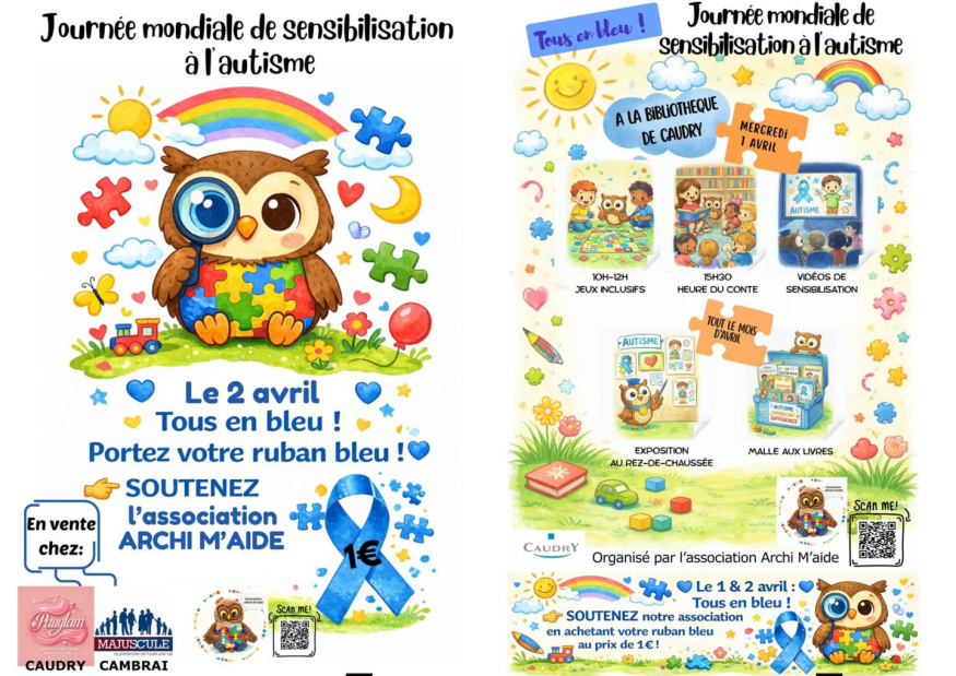 Dans cette dynamique solidaire, un ruban bleu – symbole international de soutien à la cause de l’autisme – est proposé à la vente au prix de 1 €. Il est disponible chez Pauglam à Caudry ainsi qu’à la librairie Majuscule à Cambrai. Les fonds récoltés permettront de soutenir les actions de l’association.