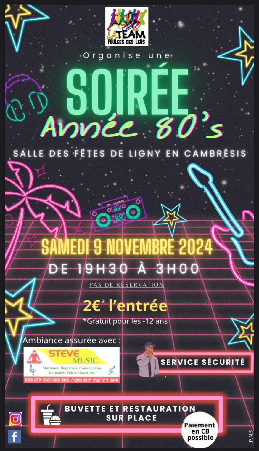 Soirée année 80’ Organisé par la Team Foulées des Leus le samedi 9 Novembre 2024 de 19h30 à 3hSalle des Fêtes de Ligny en Cambresis